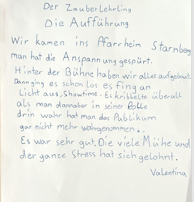 Am Mittwoch unserer Theaterprojektwoche, am 4.6.25, brachen wir von der Schule zur Schlossberghalle in Starnberg auf. Wir fuhren mit der s-Bahn und mussten ein Stück laufen, dann waren wir da. Vor der Schlossberghalle wurden Gummibärchen verteilt und wir haben Brotzeit gemacht. Anschließend gingen wir hinein. Da noch keiner da war, hatten wir die besten Plätze auf der Empore. Von dort aus hatte man einen tollen Ausblick auf die Bühne.